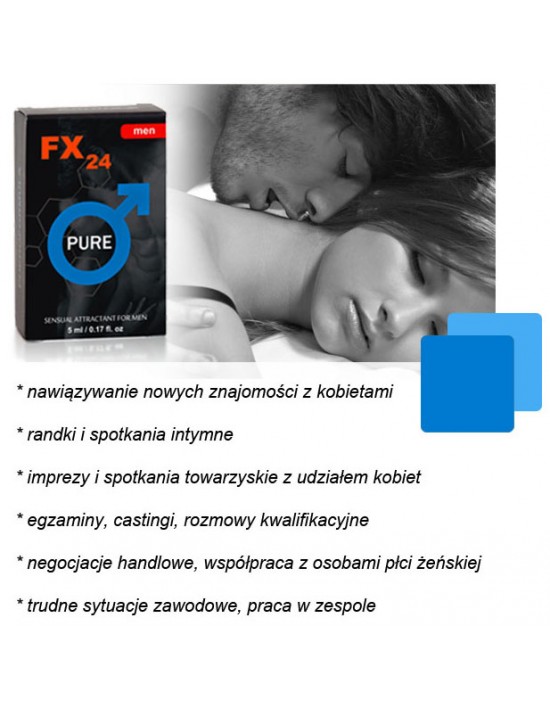 FX24 to bezzapachowe feromony, stworzone aby wywoływać w kobietach pożądanie i podniecenie, któremu nie będą w stanie się oprzeć. Specjalnie dobrany zestaw składników działa na kobiety pobudzająco i sprawia, że postrzegają mężczyznę jako wyjątkowo atrakcyjnego i pociągającego. Kobiety reagują na składniki zawarte w preparacie w sposób podświadomy, pod ich wpływem zaczynają odczuwać zwiększoną chęć do bliskiego kontaktu, stają się pobudzone i skłonne do flirtu.