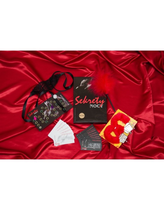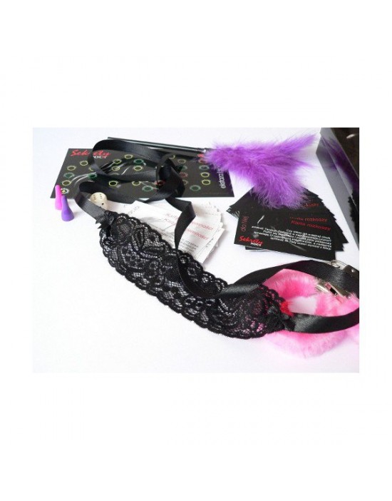 – Opaska oraz karty: przyjemności i rozkoszy (łącznie 42 sztuki kart). Opaską zasłonisz oczy lub skrępujesz partnera/partnerkę. Karty powiedzą Ci jakie ekscytujące zadania dziś przed Wami. Razem sprawią, ze oszalejecie z namiętności!