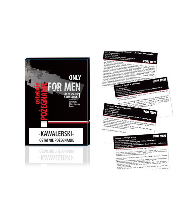 To coś więcej niż gra - to gadżet zamknięty w paczce papierosów, mieści się w kieszeni. A może zastanawiasz się jak namówić męskie stado na taki rodzaj Ostatniego Pożegnania? Gwarantujemy, że wystarczy flaszka, parę kieliszków i otwarta paczka gry.