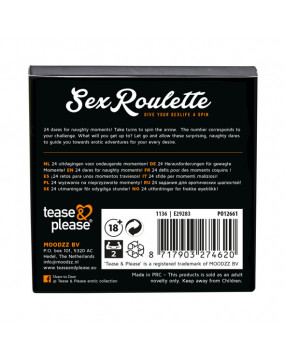 Sex Roulette to najnowsza gra autorstwa Tease and Please. Rozpal niegrzeczne emocje w swoim życiu miłosnym jednym ruchem strzałki planszy. Strzałka wskazuje liczbę, która decyduje o tym, jakie wyzwanie erotyczne czeka na Ciebie. Nie ma wątpliwości, że 24 wyzwania w edycji Naughty Play dodadzą niegrzecznego charakteru Twojemu życiu seksualnemu, zapewniając (jeszcze) bardziej zabawne, seksowne doznania. Czy jesteś wystarczająco niegrzeczny, aby się zanurzyć? Wskoczcie razem i cieszcie się zabawą, zmysłową przygodą i sobą nawzajem.