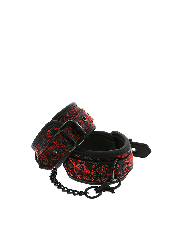 Mankiety w połączeniu z czarnym niklowanym łańcuchem, są wyłożone miękkim, a jednocześnie wytrzymałym materiałem z neoprenu, co zapewnia seksowną i komfortową zabawę.