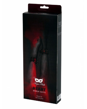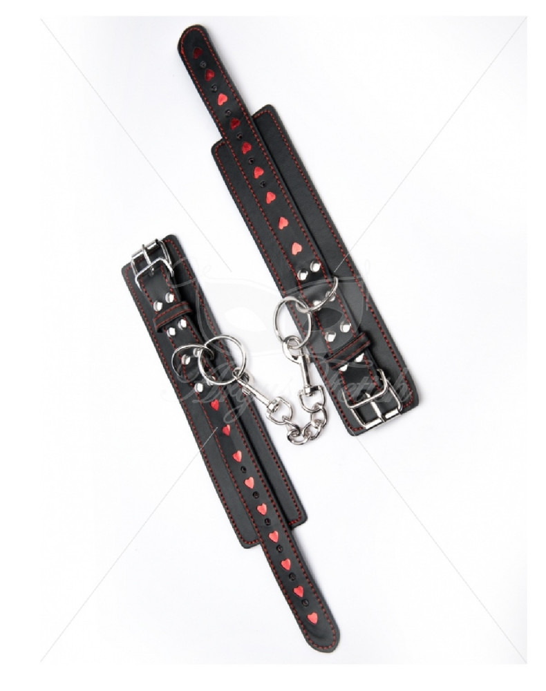 Klasyczne czarne mankiety na kostki z małym twistem w kolorze czerwonym z serduszkami wykonane są ze skóry i bezniklowych okuć. Są bezzapachowe, bardzo trwałe i wystarczająco wytrzymałe do wszelkiego rodzaju zabaw łóżkowych. Połączenie między nimi jest za pomocą dwóch karabińczyków, które można odpiąć i połączyć razem lub z czymś za pomocą linki. Końcówki są zszyte czerwoną nicią, dzięki czemu będą bardzo trwałe. Rozmiar jest idealny dla każdego. Wymiary pudełka to 30x12,5x3,8 cm
