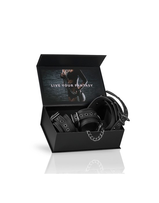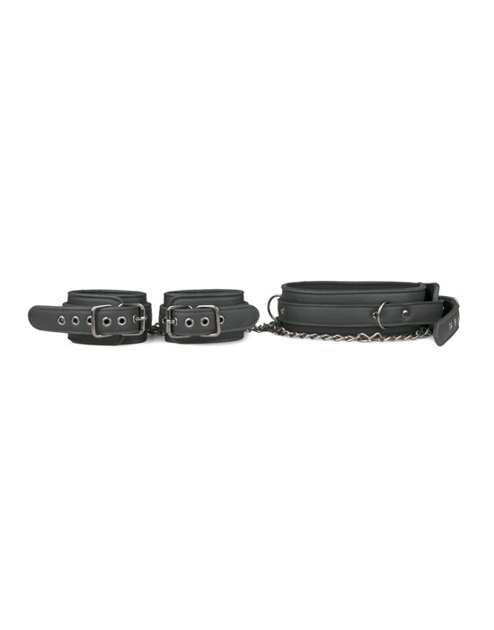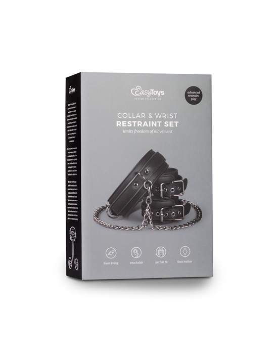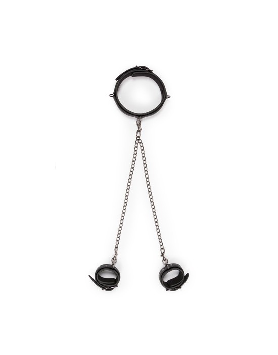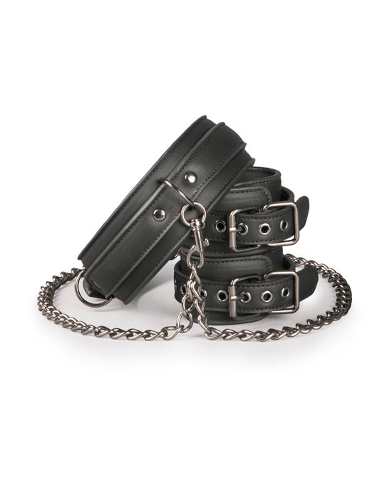 Masz kontrolę, kiedy twój partner ma na sobie ten fantastyczny zestaw niewoli! Składa się z kołnierza na szyję, połączonego z mankietami na nadgarstki, które można łatwo odłączyć od siebie za pomocą klamer. Zabawki są wykonane z wytrzymałej skóry ekologicznej wyłożonej pianką, dzięki czemu są trwałe i wygodne w noszeniu. Kołnierz można regulować w zakresie od 45 do 58 cm, a mankiety można regulować w zakresie od 11 do 28 cm. Łańcuch ma długość 40 cm. Połącz ten specjalny zestaw z innymi zabawkami, takimi jak mankiety na kostki, kneble, zaciski na sutki, aby uzyskać dodatkowe ekscytujące wrażenia.