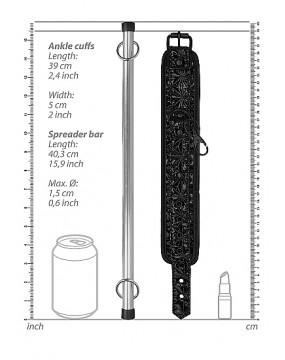 Uchyl nieco miłości oraz rozchyl kończyny kochanka, zapewniając sobie nieograniczony dostęp do najbardziej intymnych obszarów podczas erotycznej zabawy! Ta wytrzymała metalowa rozpórka posiada 2 mankiety na kostki, które gwarantują pełny dostęp i niegrzeczną zabawę. Czarne mankiety wykonano z wygodnej pianki neoprenowej i opatentowanego tworzywa winylowego z modnym diamentowym wzorem. Metalowa rozpórka OUCH! ma 40,3 cm długości i 1,5 cm średnicy. Mankiety na kostki mierzą 39 cm długości i 5,5 cm średnicy. Posiadają też zapięcie i wystarczającą liczbę oczek, aby odpowiednio dopasować zapięcie.