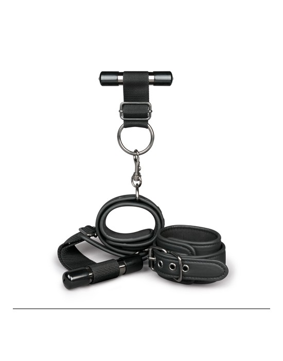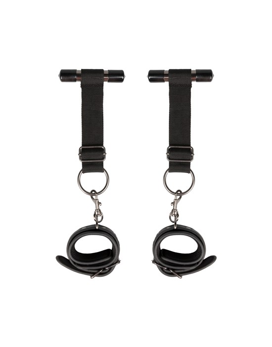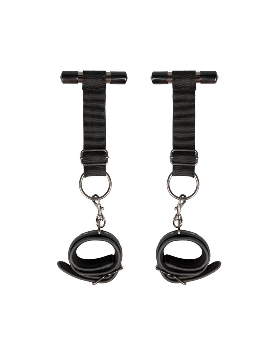 Jeśli jesteście stosunkowo początkujący w świecie niewoli, te mankiety drzwiowe są idealnymi zabawkami, aby rozpocząć przygodę. Mankiety są bardzo łatwe w użyciu. Wszystko, co musisz zrobić, to powiesić metalowe pręty nad drzwiami i zamknąć je. Związać nadgarstki partnera i nie ma dokąd pójść! Te kajdanki mogą być używane wszędzie, o ile istnieją drzwi, które mogą utrzymać ciężar. Idealne na ekscytującą przygodę w niewoli w domu lub na wakacjach. Mankiety są regulowane i są wykonane z wytrzymałej skóry ekologicznej wyłożonej pianką.