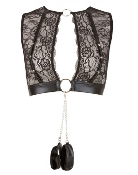 Top, suspender belt and crotchless string made out of transparent lace and black wet look. The highlight: the press studs over the breasts that are extremely easy to undo and the handcuffs with hook and loop fasteners that can be quickly attached to the decorative rings on the top or the suspender belt with the snap hooks. This means that this lingerie set can quickly be turned into a special bondage set for beginners!