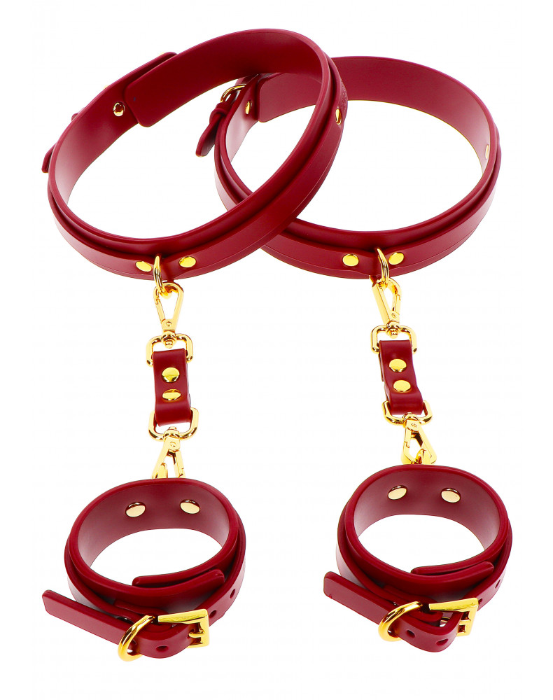 Drażnij się i ciesz z luksusowym i modnym ZESTAWEM TABOOM WRIST TO THIGH Cuffs SET i zapewnij sobie trochę czasu ze swoim partnerem. Przypnij łatwe w użyciu mankiety na nadgarstki za pomocą solidnych klipsów do mankietów na udach, aby uzyskać prawdziwe ograniczenie. Mankiety są mocne, wykonane z wysokiej jakości materiałów i idealnie nadają się na doskonałą sesję BDSM. Mankiety świetnie nadają się również jako seksowny dodatek. Przygotuj się na luksusowe doznania związane z wiązaniem dzięki temu zestawowi mankietów ze skóry wegańskiej na nadgarstek do ud.