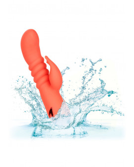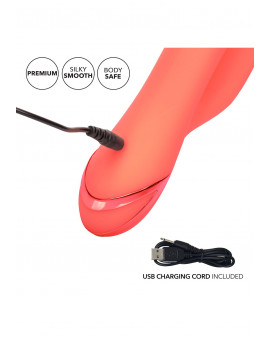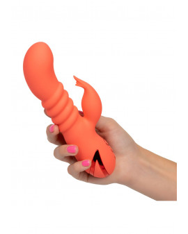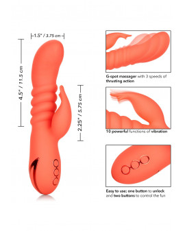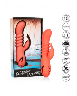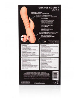 The playful California Dreaming™ Collection brings luxurious fantasies to life with the orgasmic Orange County Cutie. The ergonomically designed massager is ready to relive your favorite summer fling fantasies with 10 poweful functions of vibration and 3 knee-shaking thrusting speeds. While the flickering stimulator teases, the ribbed shaft and curved tip delivers deep thrusting, g-spot stimulation. The curved tip has a powerful back-and-forth action to make sure you always hit the right spot. The teasing tickler uses a powerful vibration motor to deliver blissful external stimulation. The flexible teaser can be used independently from the thrust function for fully customizable pleasure. Plug the provided USB cable into the self-healing charing port to recharge your passion in 2.5 hours. Thrill with up to 150 minutes of vibrating pleasure. To effortlessly control stimulation, the sleek 3-button control pad lets you independently operate the vibration and thrusting options. The high-tech memory chip remembers just how you like it resumes play on the last function used