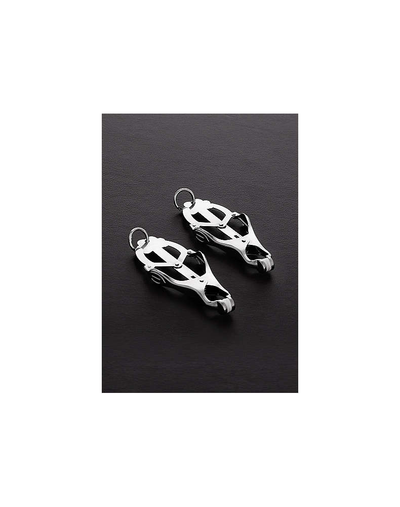 Stalowe zaciski nyplowe z końcówkami z twardej gumy. Ta para zacisków jest wyposażona w unikalny system Pull Tight, który jest obsługiwany za pomocą krótkiej linki. Im mocniej pociągasz za linkę, tym mocniej zaciskają się zaciski. Gdy mocno pociągniesz za sznurki, są one prawie niemożliwe do oderwania od sutków. - Słowo ostrzeżenia, część bólu lub wrażliwości, które powodują zaciski na brodawki, pochodzi z ograniczenia dopływu krwi do brodawek, więc nie należy ich pozostawiać zbyt długo. Ponadto, gdy zostaną usunięte, ból może być gorszy niż w momencie, gdy zostały nałożone, więc bądź przygotowany.