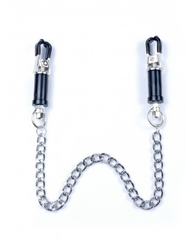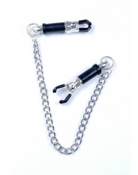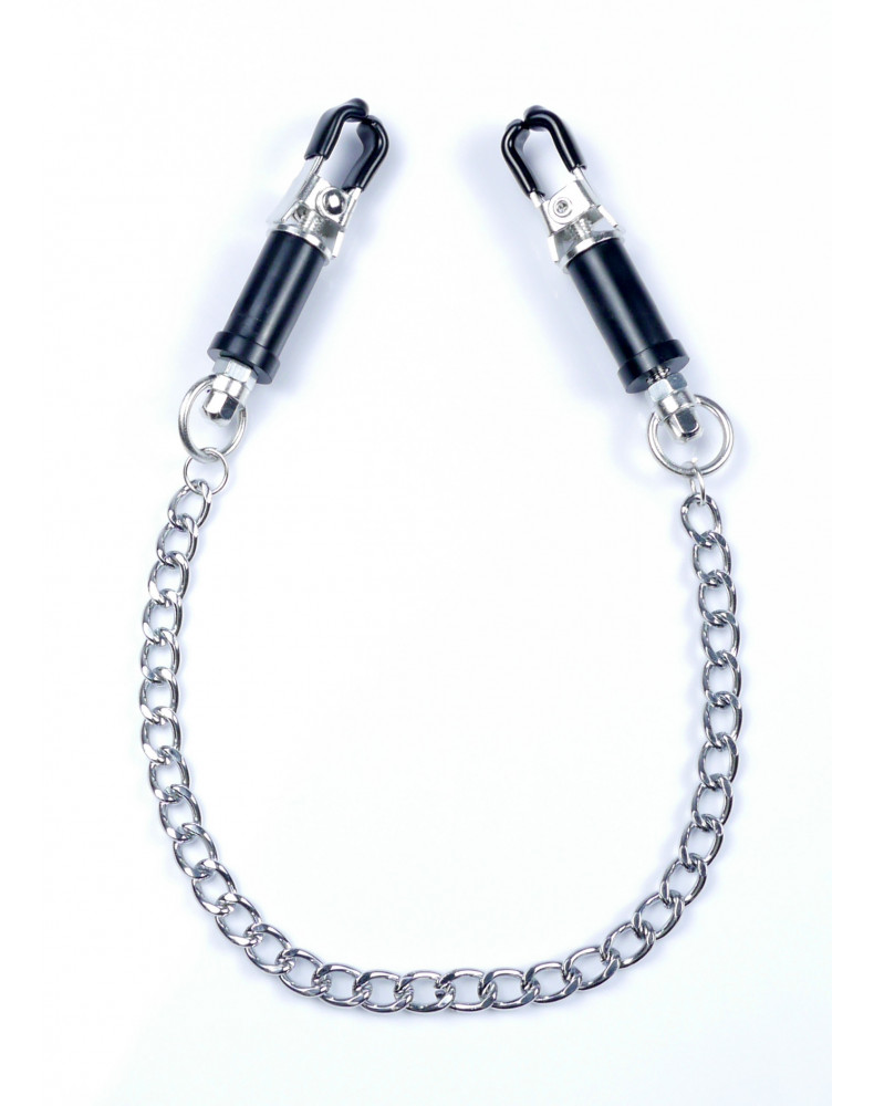 Wytrzymałe metalowe zaciski pokryte miękką gumą, te zaciski są idealne dla początkujących jak i entuzjastów. Siłę zacisku brodawki można regulować obracając górną częścią klamry, Elegancki łańcuszek łączy oba sutki, daje to niesamowitą stymulację przy każdym ruchu.