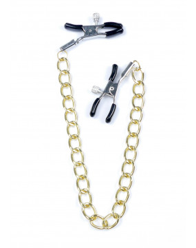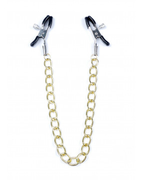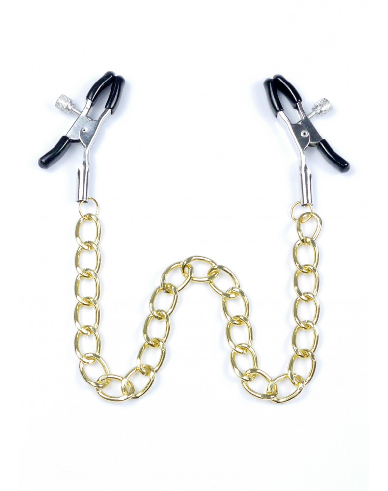 Wytrzymałe metalowe zaciski pokryte miękką gumą, te zaciski są idealne dla początkujących jak i entuzjastów. Siłę zacisku brodawki można regulować obracając śrubę, Elegancki łańcuszek łączy oba sutki, daje to niesamowitą stymulację przy każdym ruchu.