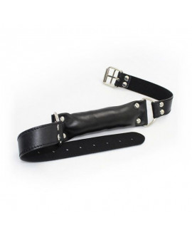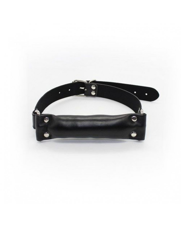 Czarny knebel w kształcie paska wzmocniony nitami.