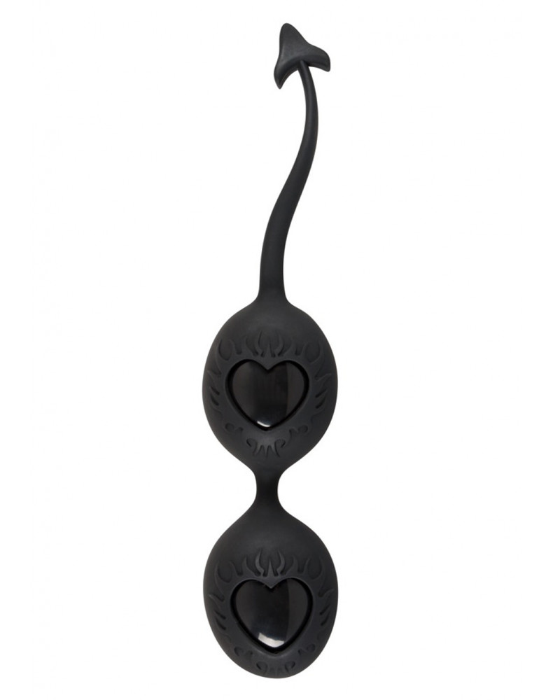 Czarne kulki z miękką silikonową osłoną i obrotowymi kulkami. Z elastycznym sznurkiem retrakcyjnym. Całkowita długość ok. 18 cm. Każda kulka Ø 3,6 cm. Materiał: silikon, ABS, nie zawiera ftalanów zgodnie z rozporządzeniem UE REACH.