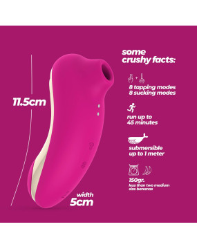 Crushious Supernova – Clitoral Suction & Tapping Stimulator to nowoczesny stymulator zaprojektowany z myślą o intensywnych i zróżnicowanych doznaniach. Dzięki połączeniu technologii ssania oraz pulsującego stukania zapewnia wyjątkową stymulację łechtaczki i pozwala odkrywać nowe poziomy przyjemności.