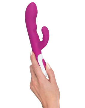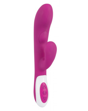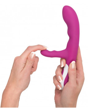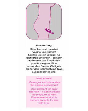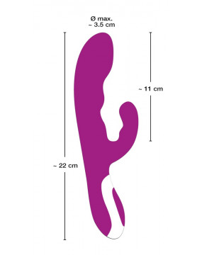 Let yourself be spoiled by this extravagant “lover” and its extraordinary features. The purple vibrator – with a clitoris stimulation arm – has two motors to enabling simultaneous vaginal and clitoral stimulation. One motor is in the shaft and the other is in the stimulation arm. The two motors each have 5 vibration modes that can be controlled separately at the push of a button. But the special highlight is the heat function in the tip: the tip heats up to a pleasant 42 °C as soon as the vibrator is switched on. It can be recharged with the included USB cable. Complete length 22 cm, insertion depth 11.5 cm, Ø 2.6-3.5 cm. Material: ABS, silicone with PU coating.
