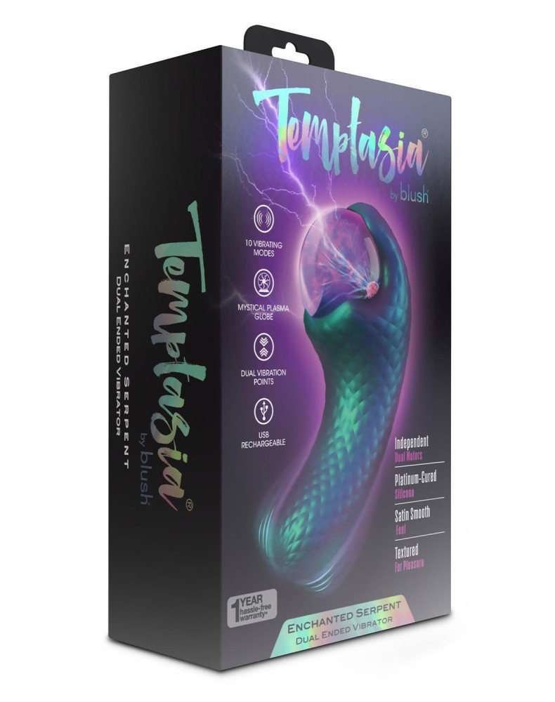 Unlock your deepest desires with Temptasia’s Enchanted Serpent, a mythical pulse vibrator that lures you into a realm of erotic fantasy. With its mesmerizing plasma globe, it illuminates your most intimate moments with a captivating and responsive visual display, while amplifying every touch. The Enchanted Serpent’s dual motors create a fully personalized play experience, allowing you to customize each setting to match your every desire. Surrender to the allure of its 10 tantalizing settings—perfectly combining internal and external sensations for pure satisfaction. Made from luxurious textured silicone, its satin-smooth surface glides seductively across your skin, igniting arousal with every touch, and its glowing pulse adds an otherworldly thrill to your intimate adventures. Waterproof and USB rechargeable, the Enchanted Serpent is always ready for your next passionate escapade. Surrender to its seductive charm and let it guide you into a new realm of pleasure and ambient fantasy.Mystical plasma globe for a visual erotic displayDual independent motors for personalized play10 Vibration settings on each end (3 speeds & 7 patterns)Luxurious textured siliconeSatin smooth feelPerfect for solo and partner play, especially in the darkMaterial: Glass / SiliconeLength 5.5 inches / 14 cmInsertable Length 2.5 inches / 6,3 cmWidth 2.75 inches / 7 cmWeight 5.1 oz. / 145 gramsBattery runtime: up to 45 minutes