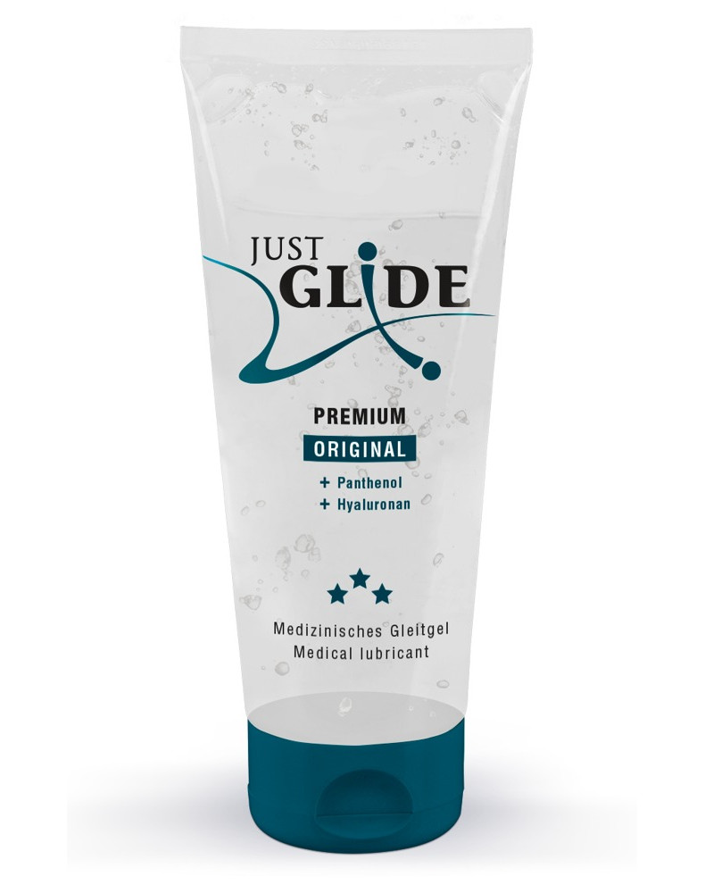 Glide into pleasure with Just Glide and enjoy long-lasting fun. Just Glide water-based lubricant is 100% vegan. It is also free from oil and non-greasy. It washes off easily. It is safe to use with latex condoms. Odourless and tasteless. The panthenol soothes the skin and creates a skin barrier. It also has a regenerating effect. The hyaluronic acid is moisturising and makes the gel feel really smooth.