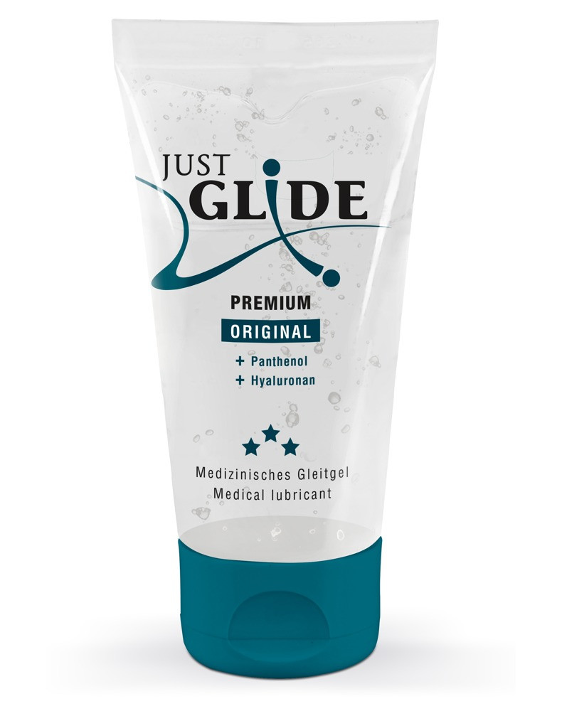 Glide into pleasure with Just Glide and enjoy long-lasting fun. Just Glide water-based lubricant is 100% vegan. It is also free from oil and non-greasy. It washes off easily. It is safe to use with latex condoms. Odourless and tasteless. The panthenol soothes the skin and creates a skin barrier. It also has a regenerating effect. The hyaluronic acid is moisturising and makes the gel feel really smooth.