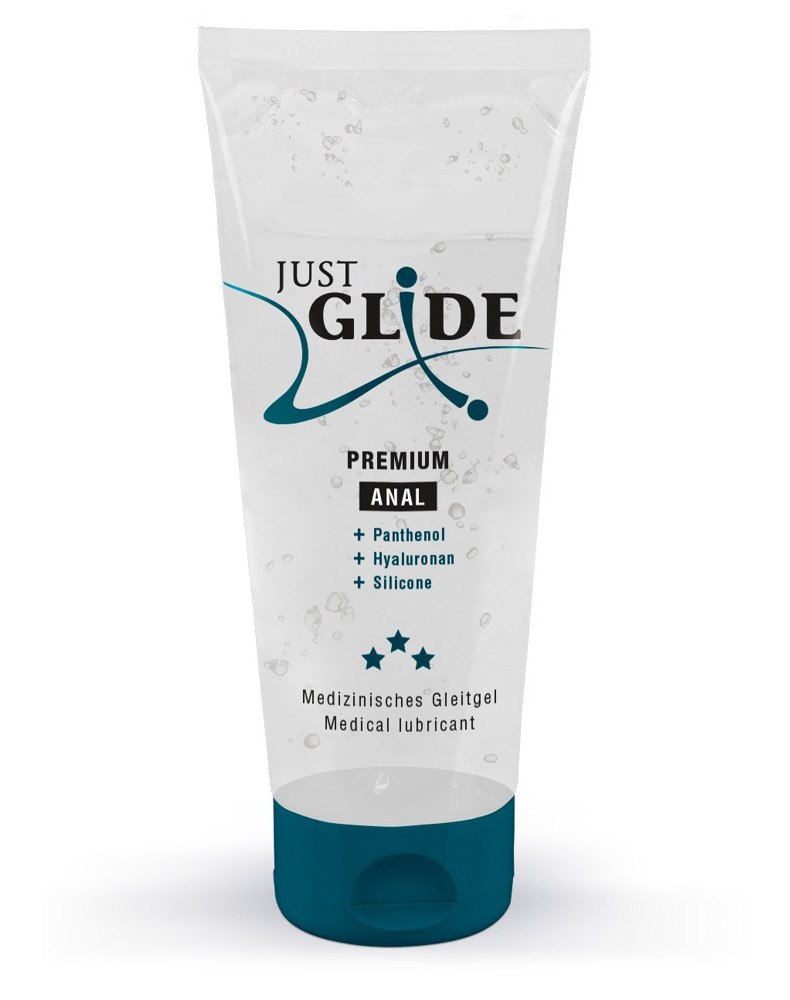 Just Glide Premium Anal is 100% vegan and it washes off easily. It is safe to use with latex condoms. Odourless and tasteless. The panthenol soothes the skin and creates a skin barrier. It also has a regenerating effect. The hyaluronic acid is moisturising and makes the gel feel really smooth. The lubricant‘s silicone oil contributes to its extremely smooth feeling which creates