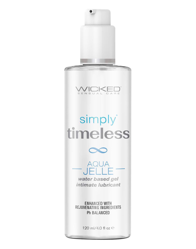 Timeless Aqua Jelle is a luxuriously thick water based gel with extra staying power to moisturize and protect.Menopause and aging can bring about change to our bodies, but our right to prioritize pleasure remains constant. The Timeless collection by Wicked gives people different options based on individual needs and preferences, and each formula has been carefully crafted using the most innovative and rejuvenation ingredients. The Timeless collection is free from glycerin, parabens and propylene glycol. Each formula can be used as a daily vaginal moisturizer.Unique supportive ingredients provide extra moisture and hydration.Featuring expanded labels with enlarged font for easy to read consumer information and support.Vegan and cruelty free.  Supportive ingredients: Aloe leaf juice, Squalane, Vitamin E, Olive leaf extract, Sodium hyaluronate.