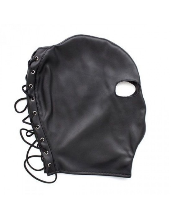 Czarna, skórzana maska niewoli, z otworami tylko na oczy.