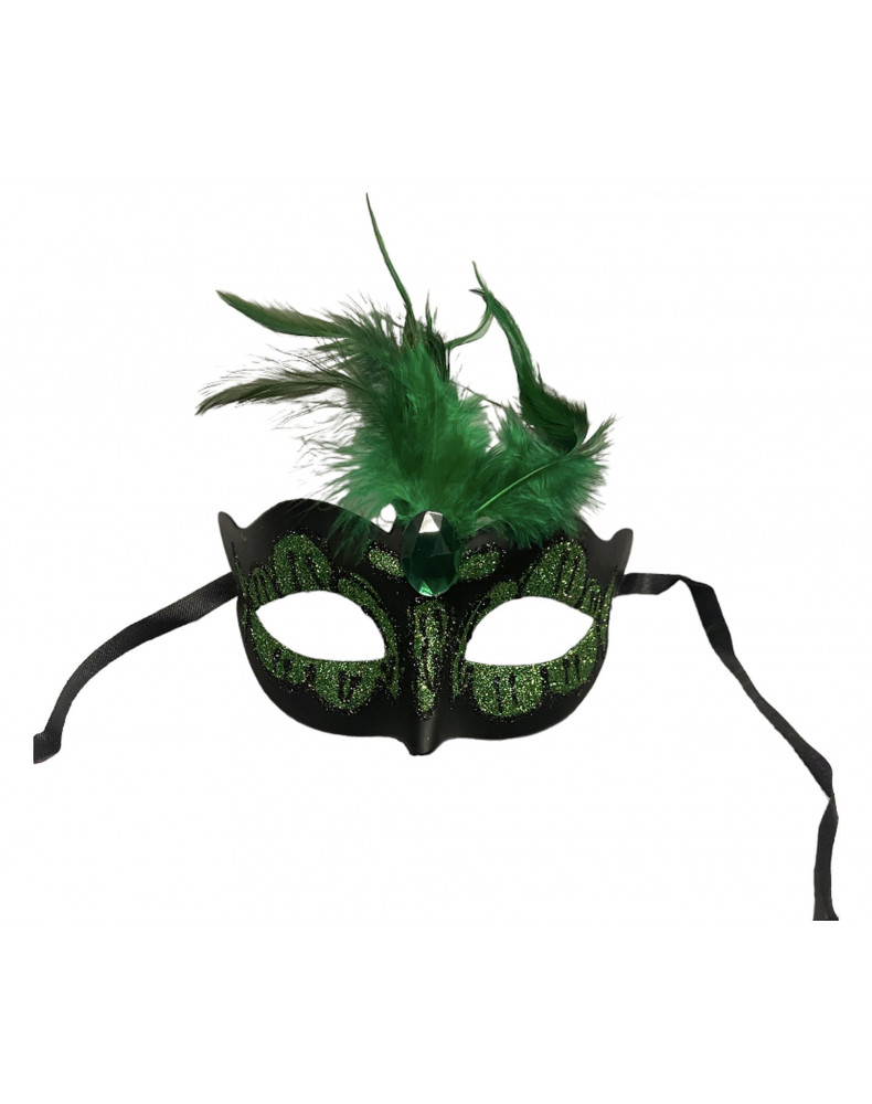 Power Escorts prezentuje Luksusową Wenecką Maskę Miłości, kolor Zielono-czarny z zielonym kamieniem i piórkiem na wierzchu – Regulowana – Moc fetyszu – Maska Kinky – Plastikowa torba