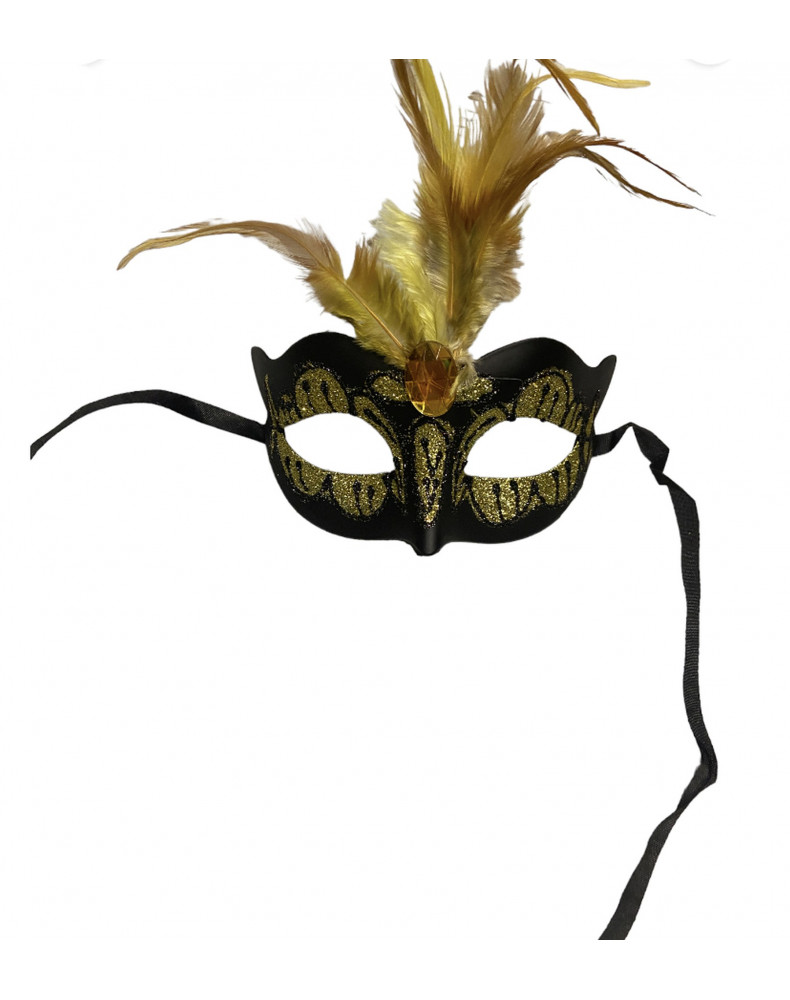 Power Escorts prezentuje luksusową wenecką maskę miłosną w kolorze żółto-czarnym z żółtym kamieniem i piórkiem na górze – Regulowana – Moc fetyszu – Maska Kinky – Plastikowa torba