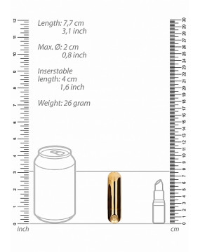 Ten mini wibrator pociskowy ma całkowitą długość 7,7 cm (3,1"), 2 cm (0,8") średnicy i waży 26 gramów (0,92 uncji). Długość wkładki 4 cm (1,6")