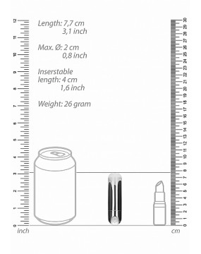 Ten mini wibrator pociskowy ma całkowitą długość 7,7 cm (3,1"), 2 cm (0,8") średnicy i waży 26 gramów (0,92 uncji). Długość wkładki 4 cm (1,6").