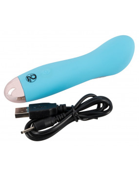 Blue mini vibrator with a concave indentation on the shaft. It has 7 different vibration modes and can be recharged with the included USB cable. Easy to use and an elegant design. Waterproof.