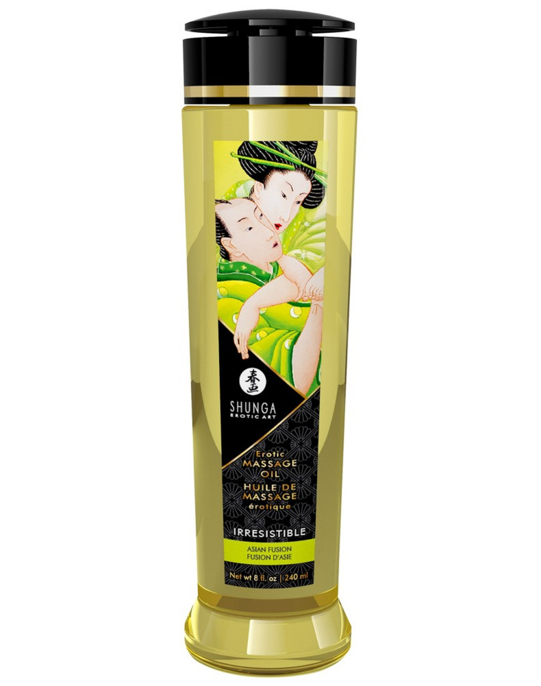 Luksusowy Erotyczny Olejek do Masażu Irresistible od Shunga o zmysłowym kwiecistym, owocowym zapachu Azji, który pobudza zmysły podczas masażu solo lub partnerskiego i sprawia, że chcesz więcej! Wegański olejek do masażu wykonany jest w 100% z naturalnych olejów tłoczonych na zimno i zawiera pielęgnującą skórę witaminę E. Delikatnie i łatwo sunie po skórze, nie pozostawiając nieprzyjemnego tłustego uczucia ani pozostałości. Wręcz przeciwnie, pozostawia skórę jedwabiście miękką! Ponadto jest bardzo bogaty dla wielu zmysłowych i namiętnych masaży całego ciała.