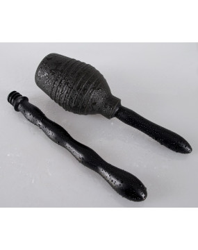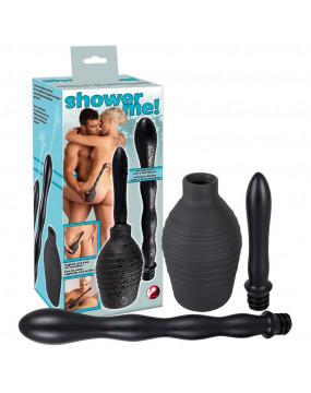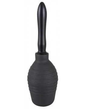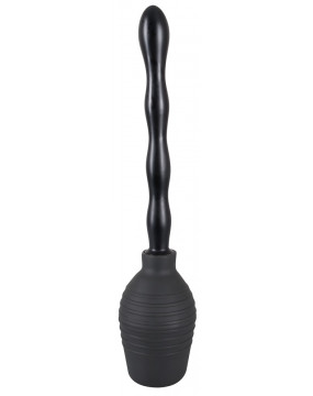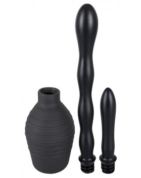 Black intimate shower (height 13 cm, volumetric capacity 300 ml) with two exchangeable screw attachments with spray nozzles. Easy to clean. Long, waved attachment: total length approx. 23 cm, ø 1.7-3 cm. Short, smooth attachment: total length approx. 11.5 cm, ø 1.9-2.3 cm. Material: PVC.
