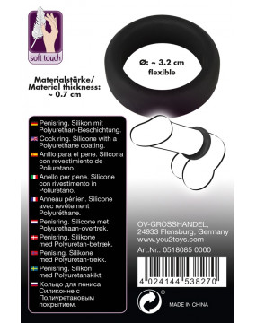 Czarny pierścień. Ø 32 mm. Grubość pierścienia 7 mm. Materiał: silikon, bez ftalanów zgodnie z Rozporządzeniem UE REACH.