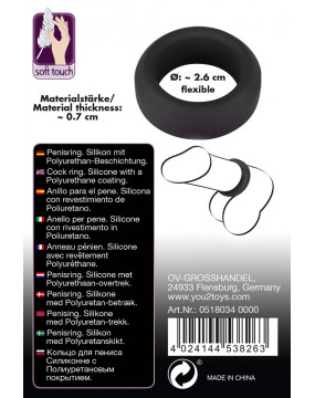 Czarny pierścień. Ø 26 mm. Grubość pierścienia 7 mm. Materiał: silikon, bez ftalanów zgodnie z Rozporządzeniem UE REACH.