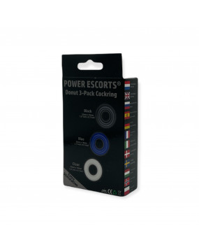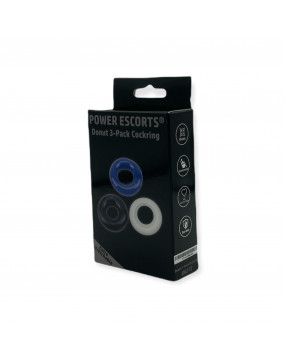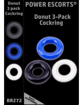 Power Escorts - BR272 - Donut Cockring 3 Pack - Super rozciągliwy - 3 kolory niebieski / przezroczysty / czarny - atrakcyjne kolorowe pudełko