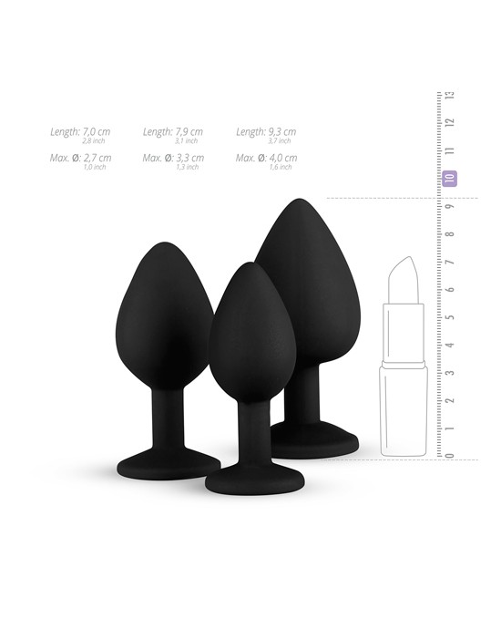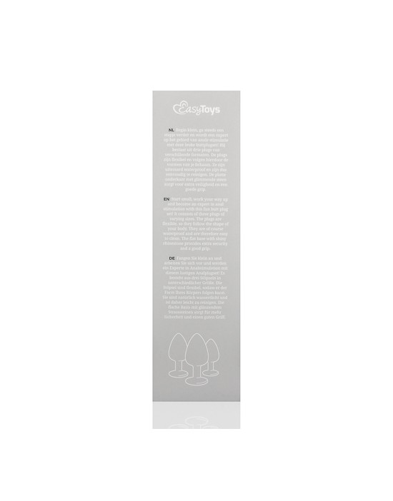 Ten 3-częściowy zestaw wtyczek jest idealny dla każdego, kto chce odkryć stymulację analną. Wtyczki analne mają różne wymiary, więc możesz zacząć od małego i pójść o krok dalej we własnym tempie. Wtyki wykonane są z cudownie miękkiego, bezpiecznego dla ciała silikonu. Płaskie dno wtyczek zapewnia bezpieczne użytkowanie.