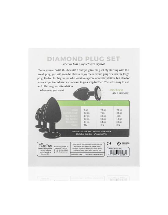 - Mały plug: Długość: 7 cm Głębokość zakładania: 6,2 cm Max. średnica: 2,7 cm min. średnica: 0,8 cm- Średni plug: Długość: 7,9 cm Głębokość zakładania: 7 cm Max. średnica: 3,3 cm min. średnica: 0,9 cm- Duży plug: Długość: 9,3 cm Głębokość wsunięcia: 8,1 cm Max. średnica: 4 cm min. średnica: 1,1 cm.