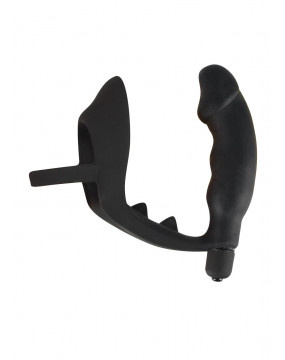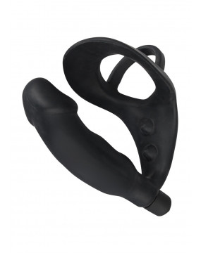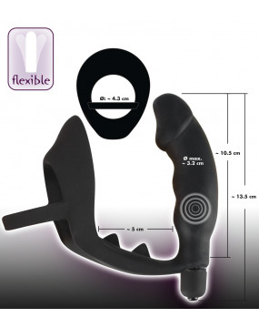 Czarny pierścień wibracyjny z wtyczką. Całkowita długość 11,2 cm, długość wtyczki 10,3 cm, długość pręta krocza 5 cm, Ø pierścienia 4,3 cm, Ø wtyczki 3,3 cm. Materiał: silikon, bez ftalanów zgodnie z Rozporządzeniem UE REACH.