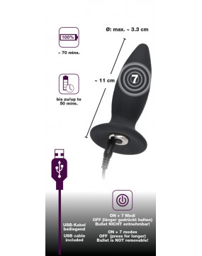 - Intensywny: wtyczka Black Velvets stymuluje Cię w 7 trybach wibracji. Jego aksamitnie miękka powierzchnia poprawia doznania. Plug powinien być używany tylko ze smarem na bazie wody. Smary na bazie silikonu mogą uszkodzić materiał.
