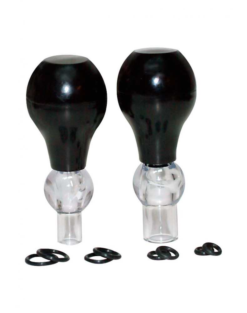 Two nipple pumps with 8 replacement rings. Just slip one of the rings over the pump´s opening and then place the opening onto your nipples. Then squeeze the pump ball. It will feel as if your partner is gently sucking them! The nipples become wonderfully erect, thanks to the vacuum and they also stay erect if you put the fixation rings around the nipples. Nipple pump with openings that have various diameters: 0.7 cm and 1.1 cm. Fixation rings in four different sizes: diameter 2 x 0.5 cm, 0.7 cm, 1 cm and 1.2 cm (slightly flexible). 10-piece set.
