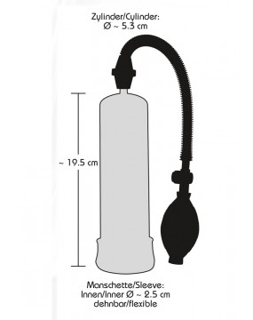 Pompa próżniowa, która zapewnia efektywny trening penisa i potencji, a wyniki są trwałe. Przezroczysty cylinder próżniowy o długości 20 cm, głębokość włożenia 18,4 cm, średnica wewnętrzna 5,3 cm, średnica zewnętrzna 5,5-2,8 cm. Ø otworu na rękaw 2,5 cm (elastyczny). Poręczna kula do pompowania z bezpiecznym zaworem ciśnieniowym. ABS, PVC, TPE, SAN