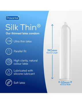 Pasante Silk Thin™ to ultra cienkie prezerwatywy lateksowe, stworzone z myślą o tych, którzy pragną maksymalnej bliskości i naturalnego odczucia podczas zbliżeń. Grubość od zaledwie 0,04 mm sprawia, że są aż o połowę cieńsze niż standardowe prezerwatywy Pasante.*