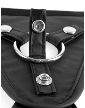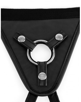 The sturdy harness in a vinyl look makes unlimited pegging fun possible and fulfills lesbian fantasies. It can be used with lots of dildos and vibrators that have a suction cup or base (not included). The included metal ring and the 3 different sized silicone rings mean that the dildo/vibrator stays securely in place during thrusting movements. The harness can be adjusted around the waist and thighs.