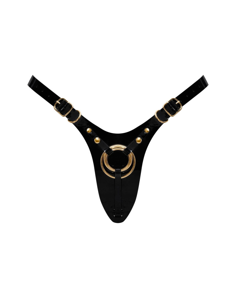 Inspirowana klasycznymi stringami, ta uprząż została zaprojektowana jak biżuteria na ciało – z błyszczącym wykończeniem w stylu „patent” i minimalistycznym krojem, który eksponuje pośladki z niezwykłą finezją.