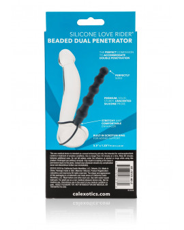 The Silicone Love Rider Beaded Dual Penetrator turns your pleasurable encounters into a memorable orgasmic experience. The sturdy beaded probe lets you spice up your erotic activities without the need to invite a third person along. With this versatile penetrator, you can share the experience of the ‘filled up’ double penetration feeling with your lover. The Silicone Love Rider Beaded Dual Penetrator measures 5.75” x 1”/14.5 cm x 2.5 cm and is made from unscented premium silicone. The flexible shaft features a selection of smooth, graduated beads that provide intense pleasure. For comfortable and pleasurable insertion, the penetrator shaft also has stretchy loops that slip over the erect penis and provide testicular support.