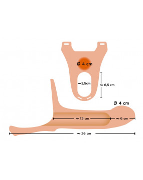 Complete length dildo 19 cm, insertion depth 13 cm, outer Ø 4 cm, inner Ø 3.5 cm. 6 cm enlargement thanks to the solid glans. Testicle ring Ø 3.5 cm. Hip belt with hook and loop fasteners at least 70 cm long (very flexible), straps with press studs at least 37 cm long. Dildo: silicone with a PU coating; straps: 70% polyester, 30% latex.