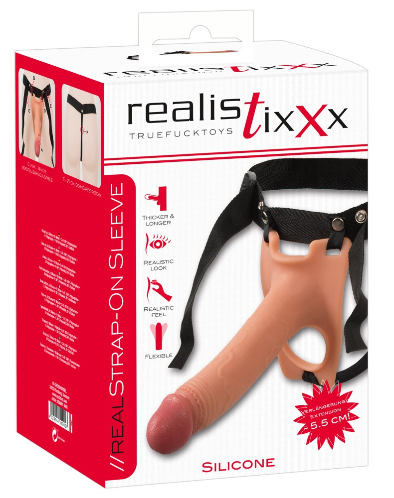 The penis will be extended by a terrific 5.5 cm and will be a striking 1.4 cm thick. This sleeve feels extremely realistic and also looks very appealing because of its pink glans and slight veins. The testicle hole makes sure that the sleeve doesn't slip. The partner is then also invited to give the testicles some special attention. The waist strap is adjustable and removable.The strap between the buttocks also helps the sleeve to stay in place and it is very stretchy and removable. Perfect for anyone who want's to have a bit more!