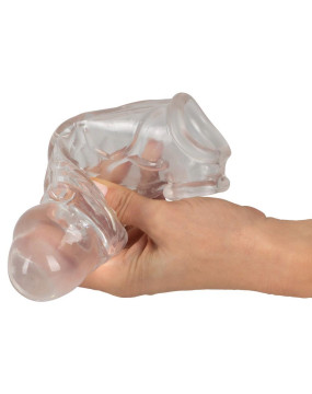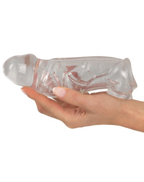 The transparent Penis Sleeve with extension + ball ring from Crystal Clear has pronounced veins. It helps the penis get in top form for fulfilling moments of pleasure. The tight-fitting, erection-supporting sleeve is made out of soft, stretchy material and it goes over the erect penis. The integrated ball ring fits tightly but comfortably and doesn't slip off. The large outer diameter and the thickness of the material mean that the girth of the penis is increased a lot. The solid glans also lengthen the penis by 5 cm!