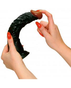 Czarne dildo to bardzo realistyczna replika z ogromnym żołędziem i wyraźnymi żyłami. Na solidnej podstawie z przyssawką. Bardzo elastyczny. 23 cm długości, Ø 4 do 4,5 cm.