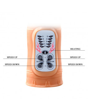 Zaawansowany technologicznie wibrator ze stymulatorem łechtaczki i wyrazistą głową. Posiada 5 trybów wibracji i 5 trybów obrotu, które są wygodnie sterowane za pomocą przycisków na pilocie zdalnego sterowania podstawy zabawki. Wibrator posiada funkcję grzania (do 48 stopni), którą można łatwo włączać i wyłączać za dotknięciem przycisku. Wibrator ładuje się za pomocą ładowarki z adapterem USB (w zestawie) W zestawie znajduje się również torba do przechowywania zabawek.